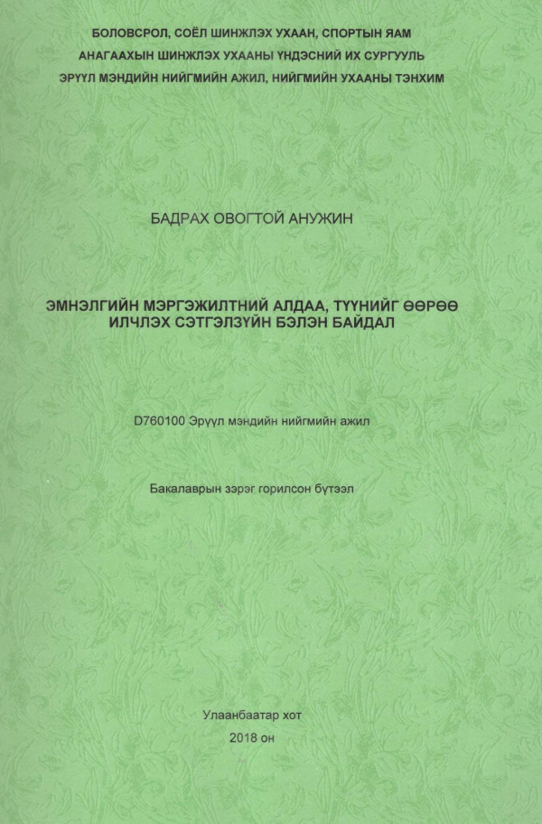 Эмнэлгийн мэргэжилтний алдаа, түүнийг өөрөө илчлэх сэтгэлзүйн бэлэн байдал : D:760100-Эрүүл мэндийн нийгмийн ажил : Бакалаврын зэрэг горилсон нэг сэдэвт бүтээл /Дипломын ажлын удирд. ФУ-ны д-р Ц.Нямсүрэн ; Дипломын ажлын шүүмж. АУ-ны д-р, Хууль зүйн ухааны магистр М.Цэрэнбат