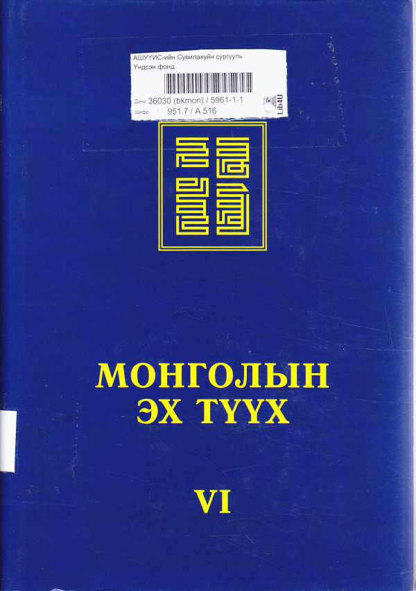 | Намтар, түүх | Эрдэм шинжилгээний номын сан Уншлага№1 | 951.7 | Available | 2017.06.18 | 2018.07.05 | 2019.06.24 | 2020.06.04 | 2020.08.19 | 2022.08.17 | 2023.07 | 2024.05.20 | 2024.09.18 | ATNS-AUM00190 |