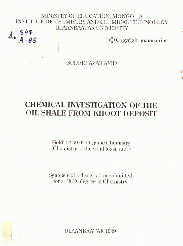 Chemical investigation of the oil shale from Khoot deposit: Synopsis of a dissertation submitted for an Ph.D. degree in Chemistry: 02.00.03 - Organic Chemistry (Chemistry of the solid fossil fuel) /Scien. supervisor Doctor of Philosophy in Chemistry, Associate Prof. B.Purevsuren, Doctor of Philosophy in Chemistry J.Dugarjav ; Oppon. Doctor of Sciences, Prof. B.Shirchin, Doctor of Sciences, Prof. D.Jambal.