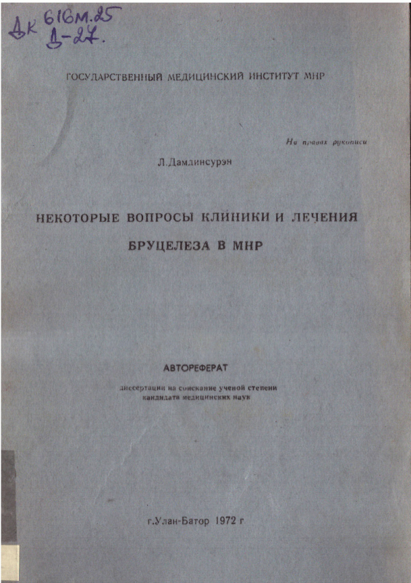 Некоторые вопросы клиники и лечения бруцелеза в МНР: Автореферат диссертации на соискание ученой степении кандидата медицинских наук: 442100-Химия (Биоорганическая химия, химия природных соединений) /Науч. рук. д-р мед. наук, проф. В.М.Маджидов, канд. мед. наук Г.Дуламсүрэн ; Офиц. опп. канд. мед. наук Ж.Дашдаваа, канд. мед. наук Ж.Самданцоодол.