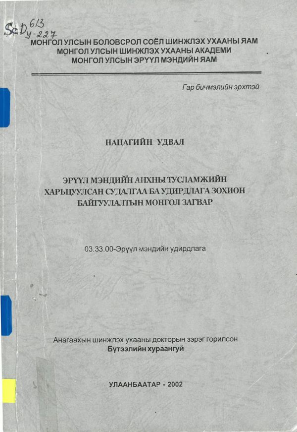 Эрүүл мэндийн анхны тусламжийн харьцуулсан судалгаа ба удирдлага зохион байгуулалтын монгол загвар: АШУ-ны докторын зэрэг горилсон бүтээлийн хураангуй: 03.33.00 - Эрүүл мэндийн удирдлага / Э/ш-ний зөвл. Акад. АШУ-ны д-р, проф. Э.Лувсандагва; Э/ш-ний шүүмж. АШУ-ны д-р, проф. Ц.Мухар, Удирдахуйн ШУ-ны д-р, проф. Д.Лхаашид, АШУ-ны д-р, дэд проф. Н.Жаргалсайхан.