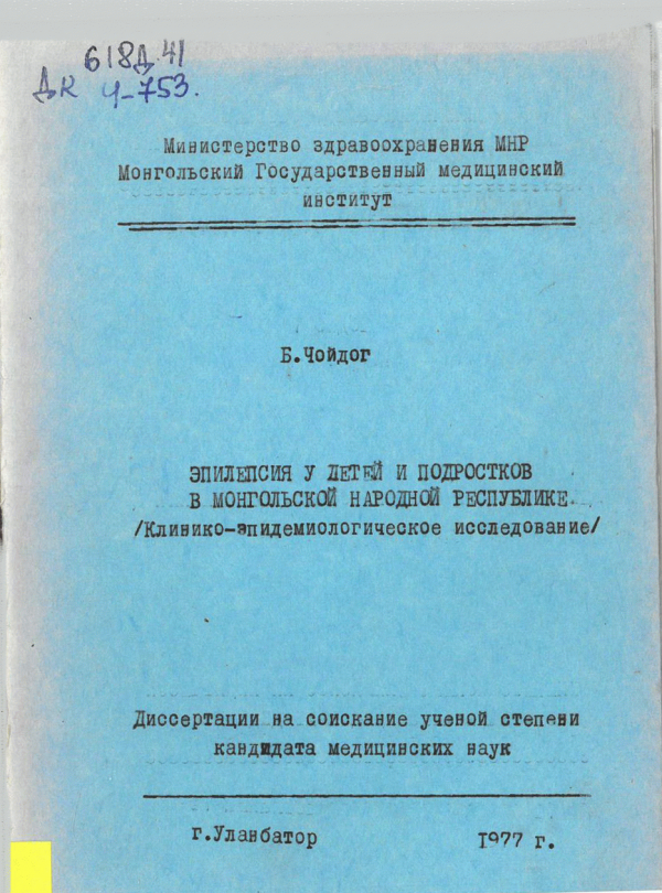 Эпилепсия у детей и подростков в Монгольской народной республике /Клинико-эпидемиологическое исследование/: Автореферат диссертации на соискание ученой степени кандидата медицинских наук /Науч. рук. канд. мед. наук Ц.Гүрдорж, канд. мед. наук Л.П.Васильева.