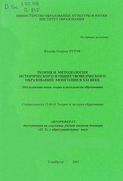 Теория и методология исторического и обществоведческого образований Монголии в XXI веке (Исследование основ теории и методологии образования): Автореферат диссертации на соискание ученой степени д-ра образовательных наук: 13.00.01 - Теория и история педагогики /Науч. рук. д-р истор. наук, проф. засл. деятель науки Ч. Далай, акад. д-р эком. наук, проф. Б. Энхтүвшин; Офиц. опп. д-р пед. наук, проф. Т. Намжил, д-р фил. наук, проф. Г. Лувсанцэрэн