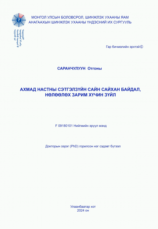 | PhD дирссертаци | Эрдэм шинжилгээний номын сан Эрдэм шинжилгээний уншлагын танхим | 362.1 С 339 | Available | ATNS-PHD00557 |