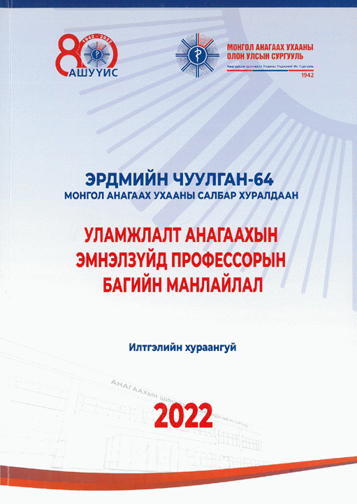 Халиун Б, Молор-Эрдэнэ П, Сээсрэгдорж С, Рэгзэдмаа Д, Батжаргал А, Цэнд-Аюуш Д, Хишигжаргал С and Анагаахын Шинжлэх Ухааны Үндэсний Их Сургууль. Эрдмийн чуулган - 64: Монгол анагаах ухааны салбар хуралдаан. Улаанбаатар: Удам соёл хэвлэлийн газар. 2022.