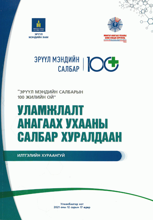 Алимаа Т, Халиун Б, Цэнд-Аюуш Д, Чимэдрагчаа Ч, Эрүүл Мэндийн Яам and Монгол Анагаах Ухааны Олон Улсын Сургууль. Уламжлалт анагаах ухааны салбар хуралдаан: Эрүүл мэндийн салбарын 100 жилийн ой. Улаанбаатар: . 2021.