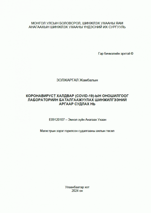 Коронавируст халдвар (covid-19)-ын оношилгоог лабораторийн баталгаажуулах шинжилгээний аргаар судлах нь: Магистрын зэрэг горилсон судалгааны ажлын төсөл: E09120107 - Эмнэлзүйн Анагаах Ухаан / Судлаач: Золжаргал, Жамбалын; Судалгааны зөвлөх багш: Анагаах ухааны доктор Н. Золмөнх; Судалгааны төслийн албан ёсны шүүмжлэгч: Анагаах ухааны доктор, профессор А. Аварзэд.