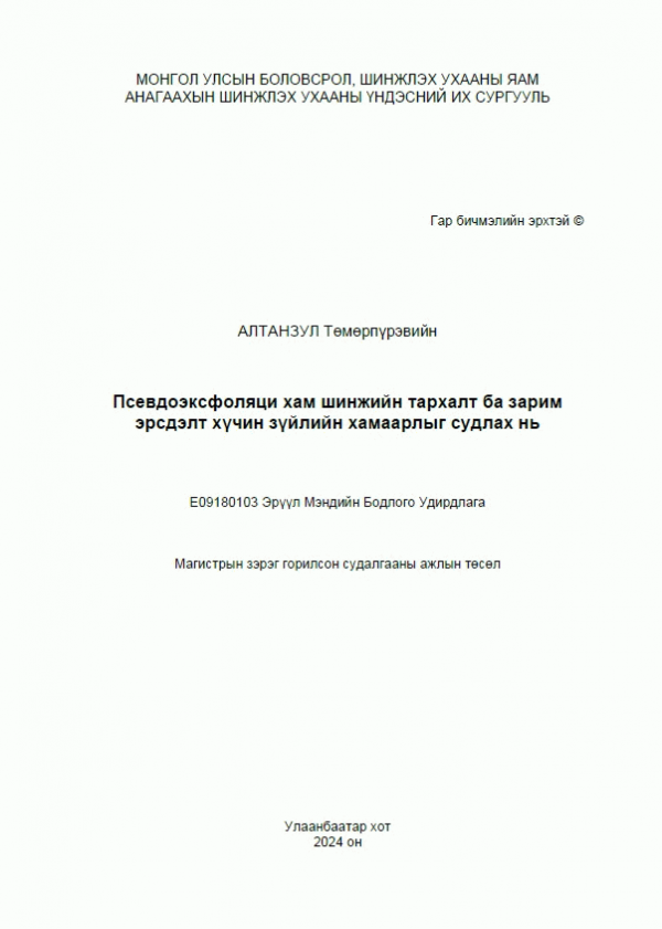 Псевдоэксфоляци хам шинжийн тархалт ба зарим эрсдэлт хүчин зүйлийн хамаарлыг судлах нь: Магистрын зэрэг горилсон судалгааны ажлын төсөл: EO9180103 - Эрүүл мэндийн бодлого, удирдлага / Судлаач: Алтанзул, Төмөрпүрэвийн; Судалгааны төслийн удирдагч: Анагаах ухааны доктор, дэд профессор С. Мягмарчулуун; Судалгааны төслийн албан ёсны шүүмжлэгч: Анагаах ухааны доктор, дэд профессор Ш. Шатар.