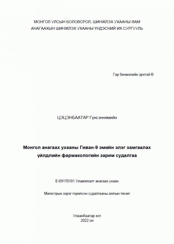 Цэцэнбаатар Гүнсэннямын, Сарнай Ц and Анагаахын Шинжлэх Ухааны Үндэсний Их Сургууль. 2022. Монгол анагаах ухааны Гиван-9 эмийн элэг хамгаалах үйлдлийн фармакологийн зарим судалгаа. Улаанбаатар: [Хэвлэлийн газар тодорхойгүй].