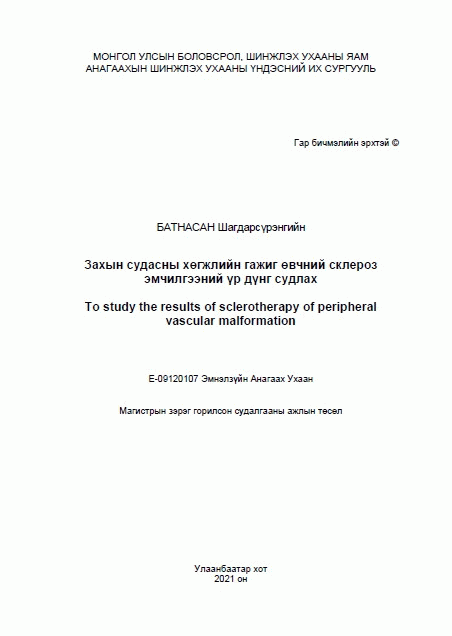 Батнасан Ш., Гончигсүрэн Д., Эрдэнэбулган Б. and Анагаахын Шинжлэх Ухааны Үндэсний Их Сургууль. (2021). Захын судасны хөгжлийн гажиг өвчний склероз эмчилгээний үр дүнг судлах = To study the results of sclerotherapy of peripheral vascular malformation. Улаанбаатар: [Хэвлэлийн газар тодорхойгүй].