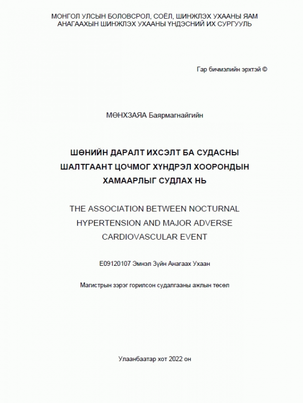 Шөнийн даралт ихсэлт ба судасны шалтгаант цочмог хүндрэл хоорондын хамаарлыг судлах нь = The association between nocturnal hypertension and major adverse cardiovascular event: Магистрын зэрэг горилсон судалгааны ажлын төсөл: Е09120107 Эмнэл Зүйн Анагаах Ухаан /Судлаач: Баярмагнайгийн Мөнхзаяа; Судалгааны төслийн удирдагч: Анагаах ухааны доктор Х. Чингэрэл; Судалгааны төслийн албан ёсны шүүмжлэгч: Анагаах ухааны доктор Б. Амартүвшин.