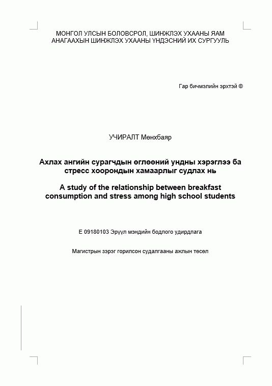 Ахлах ангийн сурагчдын өглөөний ундны хэрэглээ ба стресс хоорондын хамаарлыг судлах нь = A study of the relationship between breakfast consumption and stress among high school students: Магистрын зэрэг горилсон судалгааны ажлын төсөл: Е09180103-Эрүүл мэндийн бодлого удирдлага /Судлаач: Мөнхбаярын Учиралт; Судалгааны төслийн удирдагч: Анагаах ухааны Ц. Энх-Оюун.