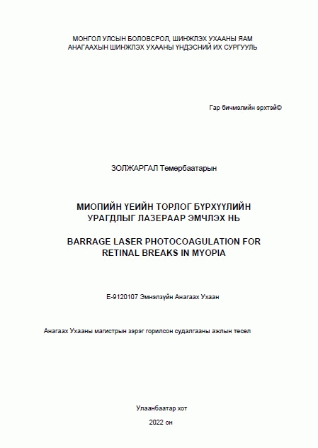 Золжаргал Төмөрбаатарын, Уранчимэг Д, Оюун-төгс Б and Анагаахын Шинжлэх Ухааны Үндэсний Их Сургууль. Миопийн үеийн торлог бүрхүүлийн урагдлыг лазераар эмчлэх нь = Barrage laser photocoagulation for retinal breaks in myopia. Улаанбаатар: [Хэвлэлийн газар тодорхойгүй]. 2022.