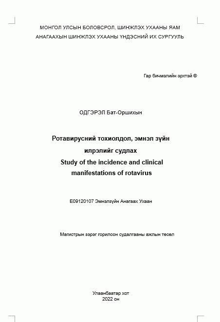 Одгэрэл Бат-Оршихын, Агиймаа Д, Оюунгэрэл Р and Анагаахын Шинжлэх Ухааны Үндэсний Их Сургууль. 2022. Ротавирусний тохиолдол, эмнэл зүйн илрэлийг судлах = Study of the incidence and clinical manifestations of rotavirus. Улаанбаатар: [Хэвлэлийн газар тодорхойгүй].