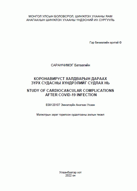 Саранчимэг Б., Чингэрэл Х., Оюунгэрэл Р. & Анагаахын Шинжлэх Ухааны Үндэсний Их Сургууль. (2022). Коронавируст халдварын дараах зүрх судасны хүндрэлийг судлах нь = Study of cardiocascular complications after covid-19 infection. Улаанбаатар: [Хэвлэлийн газар тодорхойгүй].