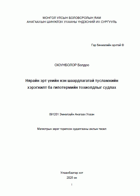 Нярайн эрт үеийн нэн шаардлагатай тусламжийн хэрэгжилт ба гипотермийн тохиолдлыг судлах: Магистрын зэрэг горилсон судалгааны ажлын төсөл: 091201 Эмнэлзүйн Анагаах Ухаан /Судлаач: Болдоогын Оюунболор; Судалгааны төслийн удирдагч: Анагаах ухааны доктор, дэд профессор Б. Баясгалантай; Судалгааны төслийн албан ёсны шүүмжлэгч: Анагаах ухааны доктор Б. Амгалан.
