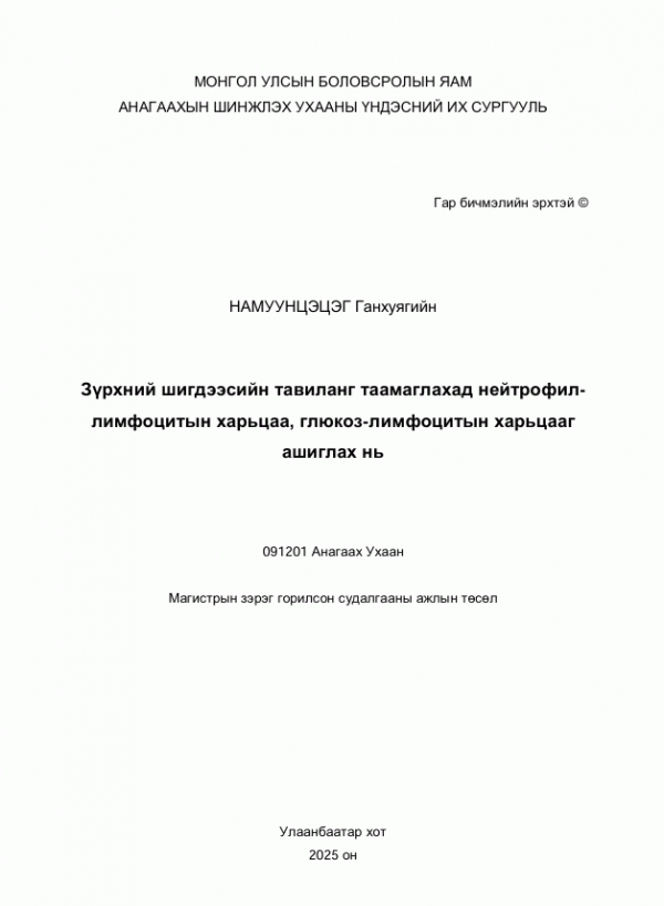 Намуунцэцэг Ганхуягийн, Чингэрэл Х, Зэсэмдорж О and Анагаахын Шинжлэх Ухааны Үндэсний Их Сургууль. 2025. Зүрхний шигдээсийн тавиланг таамаглахад нейтрофил лимфоцитын харьцаа, глюкоз-лимфоцитын харьцааг ашиглах нь. Улаанбаатар: [Хэвлэлийн газар тодорхойгүй].