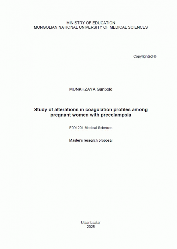 Munkhzaya Ganbold, Мөнхзаяа Г, Отгонбат А, Жаргалсайхан Б and Анагаахын Шинжлэх Ухааны Үндэсний Их Сургууль. Study of alterations in coagulation profiles among pregnant women with preeclampsia. Ulaanbaatar: Erkhes. 2025.