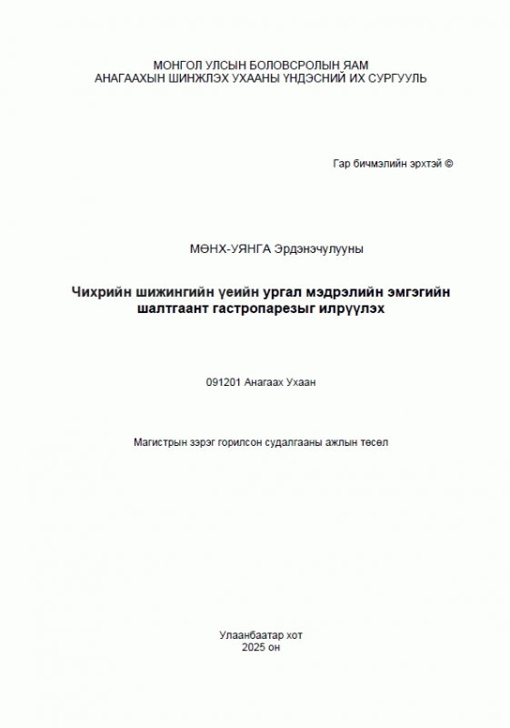 Мөнх-Уянга Эрдэнэчулууны, Оюунтөгс Б, Энх-Амар А and Анагаахын Шинжлэх Ухааны Үндэсний Их Сургууль. Чихрийн шижингийн үеийн ургал мэдрэлийн эмгэгийн шалтгаант гастропарезыг илрүүлэх. Улаанбаатар: Эрхэс. 2025.