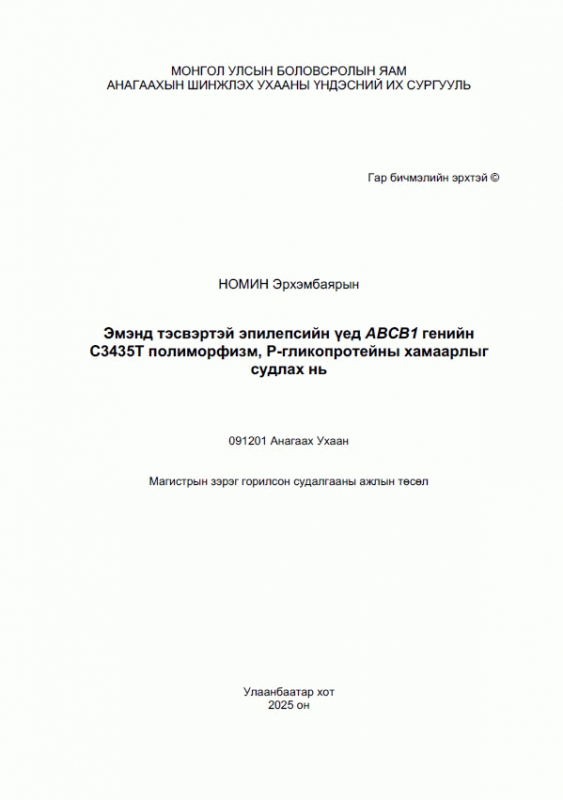 Номин Э., Жамбалдорж Ж., Шийрэвнямба А. & Анагаахын Шинжлэх Ухааны Үндэсний Их Сургууль. (2025). Эмэнд тэсвэртэй эпилепсийн үед ABCB1 генийн C3435T полиморфизм, P-гликопротейны хамаарлыг судлах нь. Улаанбаатар: Эрхэс.