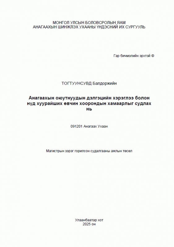 Тогтуунсувд Балдоржийн, Баясгалан П, Шамсия М and Анагаахын Шинжлэх Ухааны Үндэсний Их Сургууль. 2025. Анагаахын оюутнуудын дэлгэцийн хэрэглээ болон нүд хуурайших өвчин хоорондын хамаарлыг судлах нь. Улаанбаатар: Эрхэс.