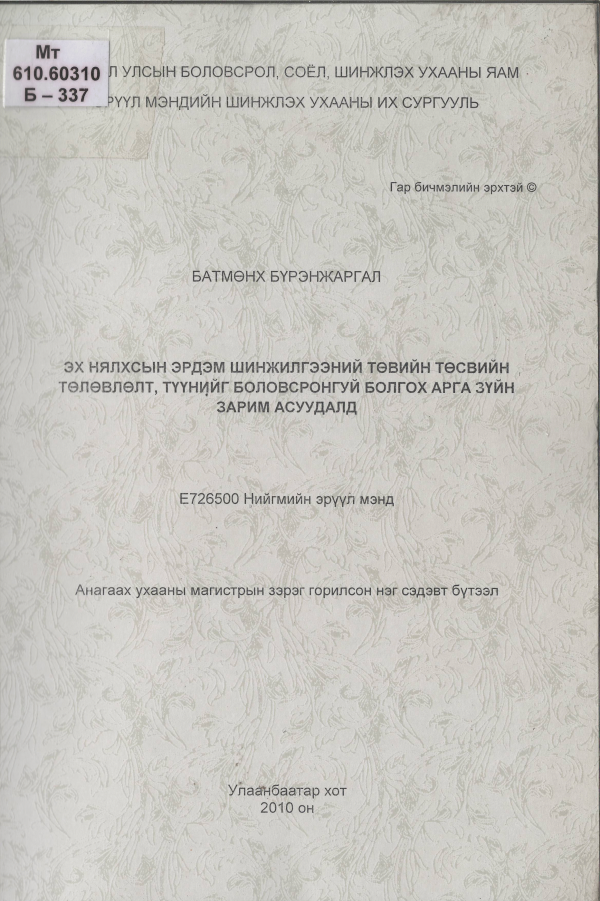 | Магистрын тезис | Эрдэм шинжилгээний номын сан Эрдэм шинжилгээний уншлагын танхим | 610.60310 | Available | 2017.06.19 | 2019.06.18 | 2020.08.27 | 2022.09 | 2023.09.18 | 2024.02.15 | ATNS-MT00075 |