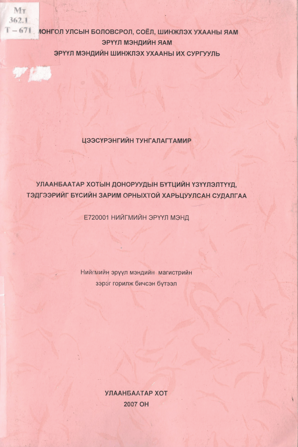 | Магистрын тезис | Эрдэм шинжилгээний номын сан Эрдэм шинжилгээний уншлагын танхим | 362.1 | Available | 2017.06.19 | 2019.06.18 | 2020.08.27 | 2022.09 | 2023.09.18 | 2024.02.15 | ATNS-MT00256 |