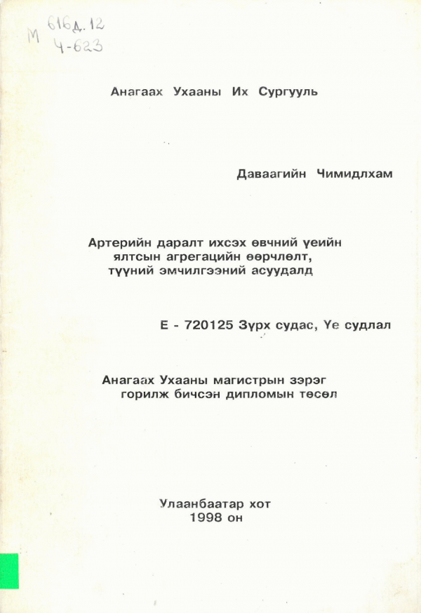 Артерийн даралт ихсэх өвчний үеийн ялтсын агрегацийн өөрчлөлт, түүний эмчилгээний асуудалд : Анагаах ухааны магистрын зэрэг горилж бичсэн дипломын төсөл : Е720125-Зүрх судас, үе судлал / Эрдэм шинжилгээний ажлын удирдагч : Анагаах ухааны доктор, профессор А. Өлзийхутаг ; Шүүмжлэгч : Анагаах ухааны доктор, профессор Л. Мягмар.