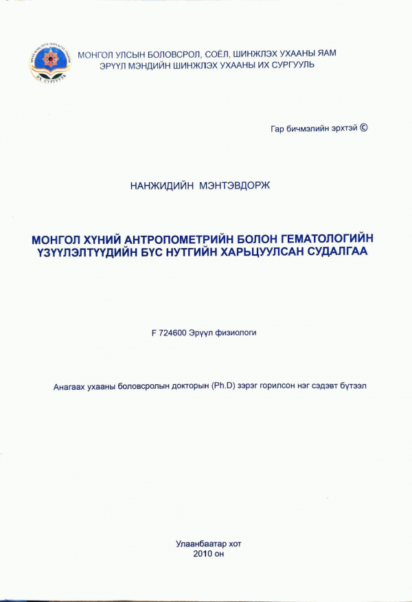 Монгол хүний антропометрийн болон гематологийн үзүүлэлтүүдийн бүс нутгийн харьцуулсан судалгаа : Анагаах ухааны доктор (Ph.D) - ийн зэрэг горилсон нэг сэдэвт бүтээл : F - 724600 - Эрүүл физиологи / ЭШ-ний ажлын удирдагч : Академич, АШУ-ны д-р, проф. Л.Лхагва, БУ-ны д-р, д/проф. С.Энэбиш ; ЭШ-ний ажлын зөвлөх : АУ-ны д-р, д/проф. С.Мөнхбаярлах ; ЭШ-ний ажлын шүүмжлэгч : БУ-ны д-р, проф. М.Эрдэнэ, АУ-ны д-р, д/проф. Г.Наран.