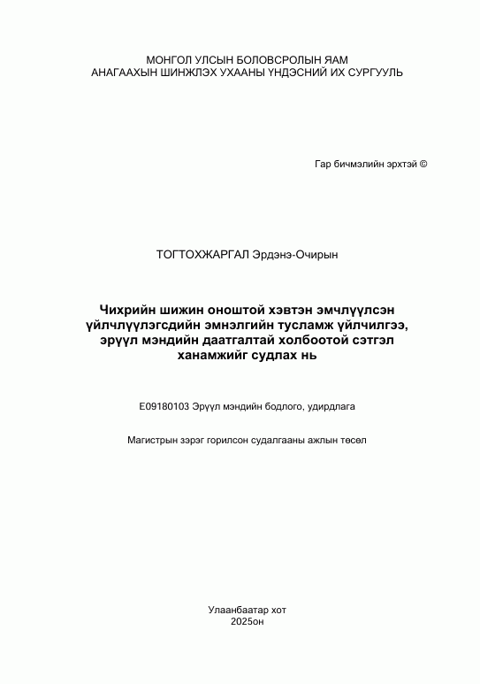 Хүүхэд, өсвөр үеийнхний дунд тохиолдож буй чихрийн шижин хэв шинж 1-ийн өвчлөл, эмнэлзүйн, бүртгэл, хяналтын судалгаа: АУ-ны магистрын зэрэг горилсон нэг сэдэвт бүтээл: Е09120107 - Эмнэлзүйн анагаах ухаан / Э/ш-ний удирд. АУ-ны д-р, проф. Х.Алтайсайхан; Э/ш-ний зөвл. АУ-ны д-р, дэд проф. Г.Эрдэнэтуяа; Э/ш-ний шүүмж. АУ-ны д-р, проф. З.Гэрэлмаа. by