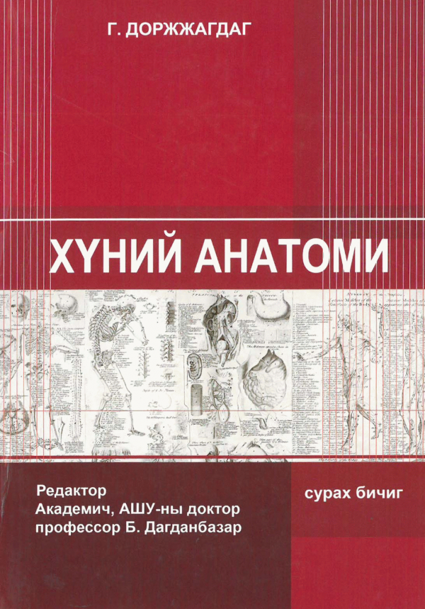 Хүний биеийн эрүүл анатоми: Их , дээд сургуулийн төгсөлтийн өмнөх, төгсөлтийн, төгсөлтийн дараах сургалтанд зориулав /Зохиогч Д. Амгаланбаатар, Б. Дагданбазар, С. Дугарсүрэн, Л. Намсрайнайдан, С. Сүхбаатар, Л. Аня, С. Энэбиш, С. Түндэврэнцэн ба бусад; Редактор С. Энэбиш, О. Эрдэнэзаяа; Ерөнхий редактор Д. Амгаланбаатар, Б. Дагданбазар. by