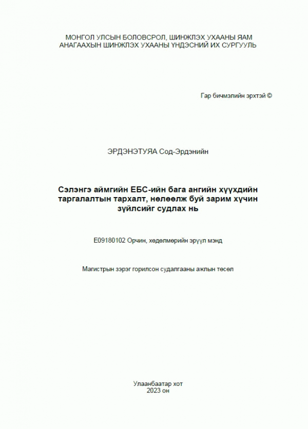 Монгол улс дахь зэсийн хүдэр баяжуулах үйлдвэрийн нөхцөл, ажиллагсдын мэргэжлээс шалтгаалсан өвчин, түүний дарамтын судалгаа: Анагаах ухааны докторын зэрэг горилсон нэг сэдэвт бүтээл: F09180102-Орчин, хөдөлмөрийн эрүүл мэнд /Э/ш-ний удирд. АУ-ны д-р, дэд проф. Э.Эрдэнэчимэг, Нийгмийн эрүүл мэндийн ухааны д-р, дэд проф. Ю.Гантөгс; Э/ш-ний зөвл. АУ-ны д-р Д.Нарансүх; Э/ш-ний шүүмж. АУ-ны д-р, проф. О.Чимэдсүрэн, АУ-ны д-р, дэд проф. Б.Сувд. by